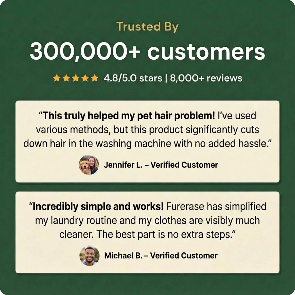 FurEraser is designed to dissolve and release pet hair during the wash, which significantly reduces the amount of hair left on clothes after the cycle. Results can vary by fabric and load, but most users notice a clear difference after the first wash.